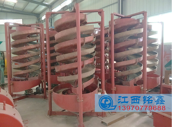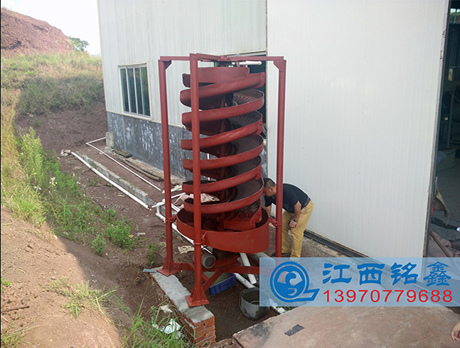 促使給礦更快的分帶,輕、重礦物運(yùn)動(dòng)軌跡差異明顯,分選效果優(yōu)于一般固定螺旋溜槽或螺旋選礦機(jī)。富集比高,有效分選粒度范圍為0.6~0.05毫米,粒度回收下限略高于螺旋溜槽。